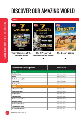 DISCOVER OUR AMAZING WORLDLEVEL 3 (4,000 HEADWORDS)The 7 Wonders of the The Desert BiomeAncient WorldThe 7 Preserved Wonders of the WorldLevel 1The Killer Whale 978-1-4715-6163-4Worms 978-1-4715-6172-6The Bottlenose Dolphin 978-1-4715-6157-3The Octopus 978-1-4715-6166-5The Loggerhead 978-1-4715-6164-1Level 2Saltwater Crocodiles 978-1-4715-6154-2Carnivorous Plants 978-1-4715-6152-8The Polar Bear 978-1-4715-6167-2The Tiger Shark 978-1-4715-6168-9The Hammerhead Shark 978-1-4715-6161-0Gharial Crocodiles 978-1-4715-6153-5The Great White Shark 978-1-4715-6160-3The Humpback Whale 978-1-4715-6162-7Aboriginal Australians 978-1-4715-6150-4Discover Our Amazing World DIGIBOOKS APPNON-FICTION (CLIL) READERS74 READERS CATALOGUE